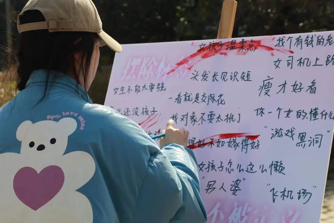 在活动现场,老师和同学们拿起颜料,将所有束缚女性的标签涂抹覆盖,拒绝定义。师生们用心灵之墨,在便利贴上绘下真挚而鼓舞人心的文字。这些点滴的言语,如同春风拂面,有时能带来长久的温暖,让人心生感激。
