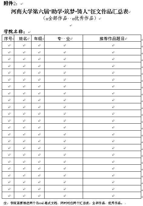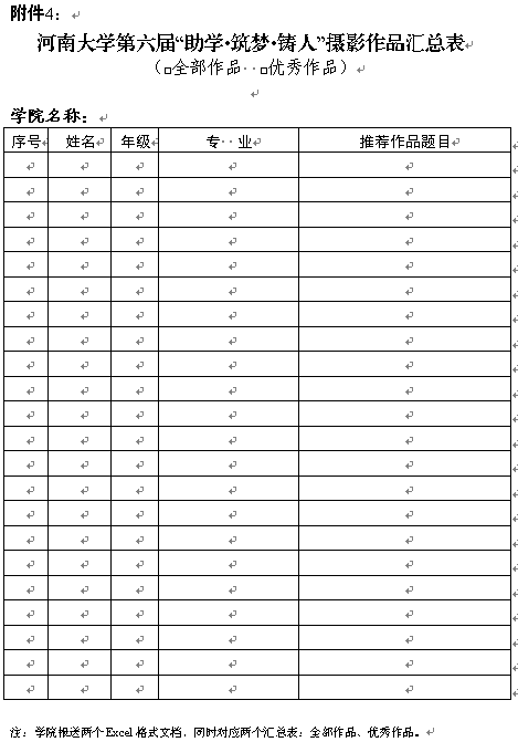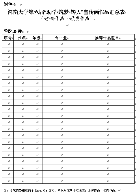 各学院要高度重视,精心组织策划,广泛宣传发动,积极引导鼓励广大学生、教师参与此次活动,扩大活动的参与面和受益面。12月24日前,按照《新葡萄8883国际官网第六届“助学·筑梦·铸人”主题宣传活动报名表》(附件1)要求,将推荐的全部作品及优秀作品进行排序,逐一将征文、宣传画及照片名修改为“序号+学院+参赛者姓名”,填写学院征文作品汇总表(附件2)、宣传画作品汇总表(附件3)、摄影作品汇总表(附件4),打包为压缩文件,以“学院+第六届‘助学·筑梦·铸人’主题宣传活动”命名,发送至邮箱15003781538@163.com。